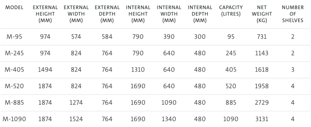 External dimensions exclude handle and hinge projections. In line with certification, weights can vary by +/- 5%.
